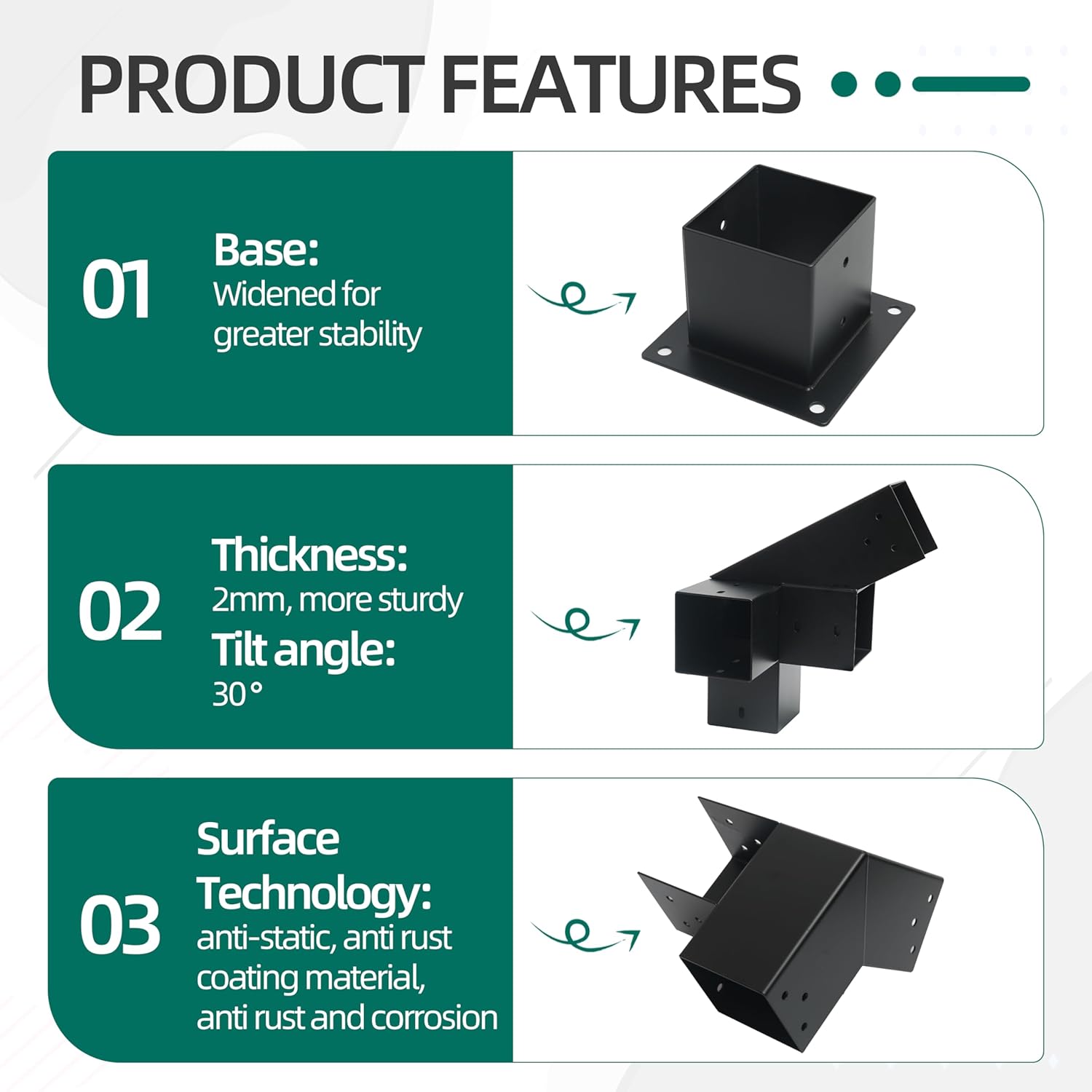 【For 30°Slanted Roof Pergola】The slanted Pergola Bracket set is suitable for 4×4 wooden post, and a 30 degree Gazebo bracket can better block sunlight and rainwater, providing a more comfortable leisure environment for outdoor spaces, allowing you to enjoy outdoor life in hot summer or rainy weather.