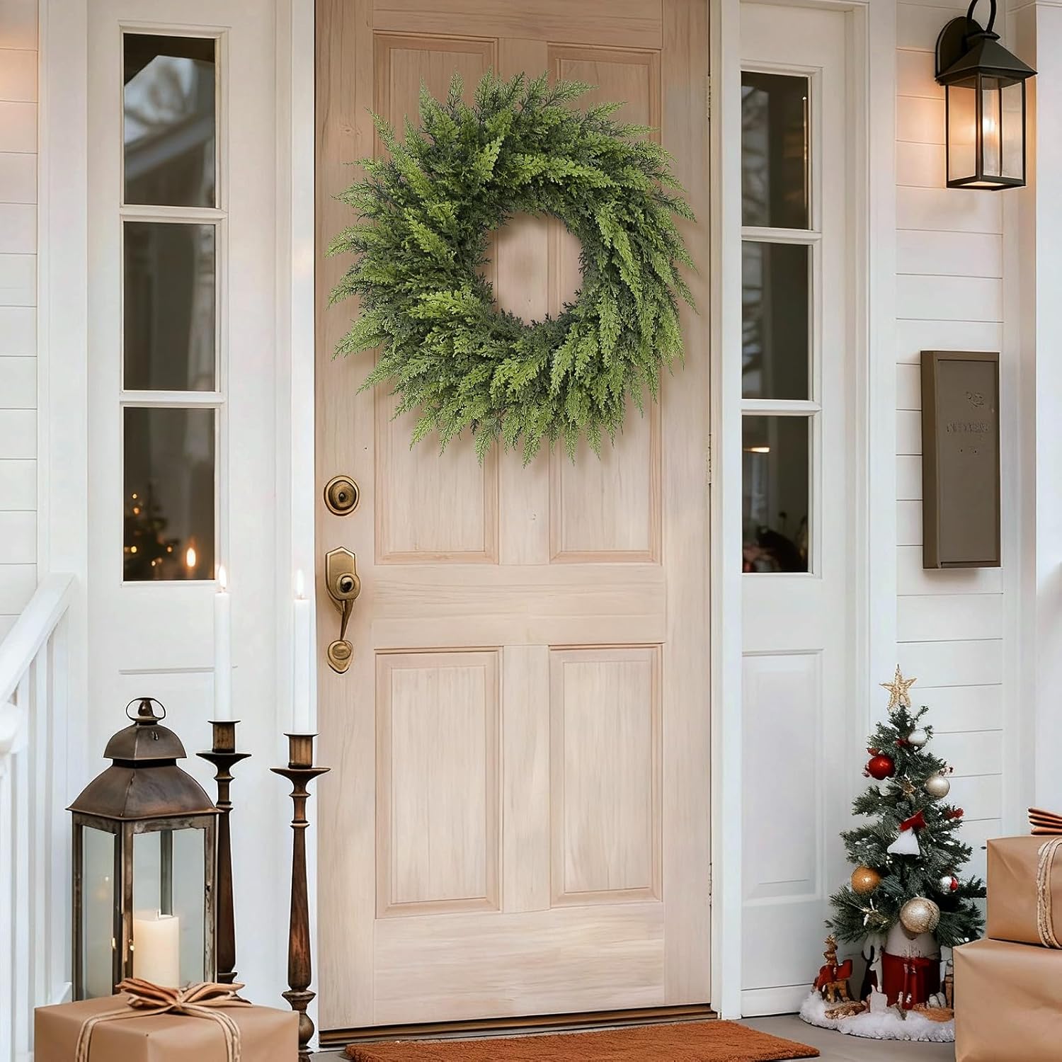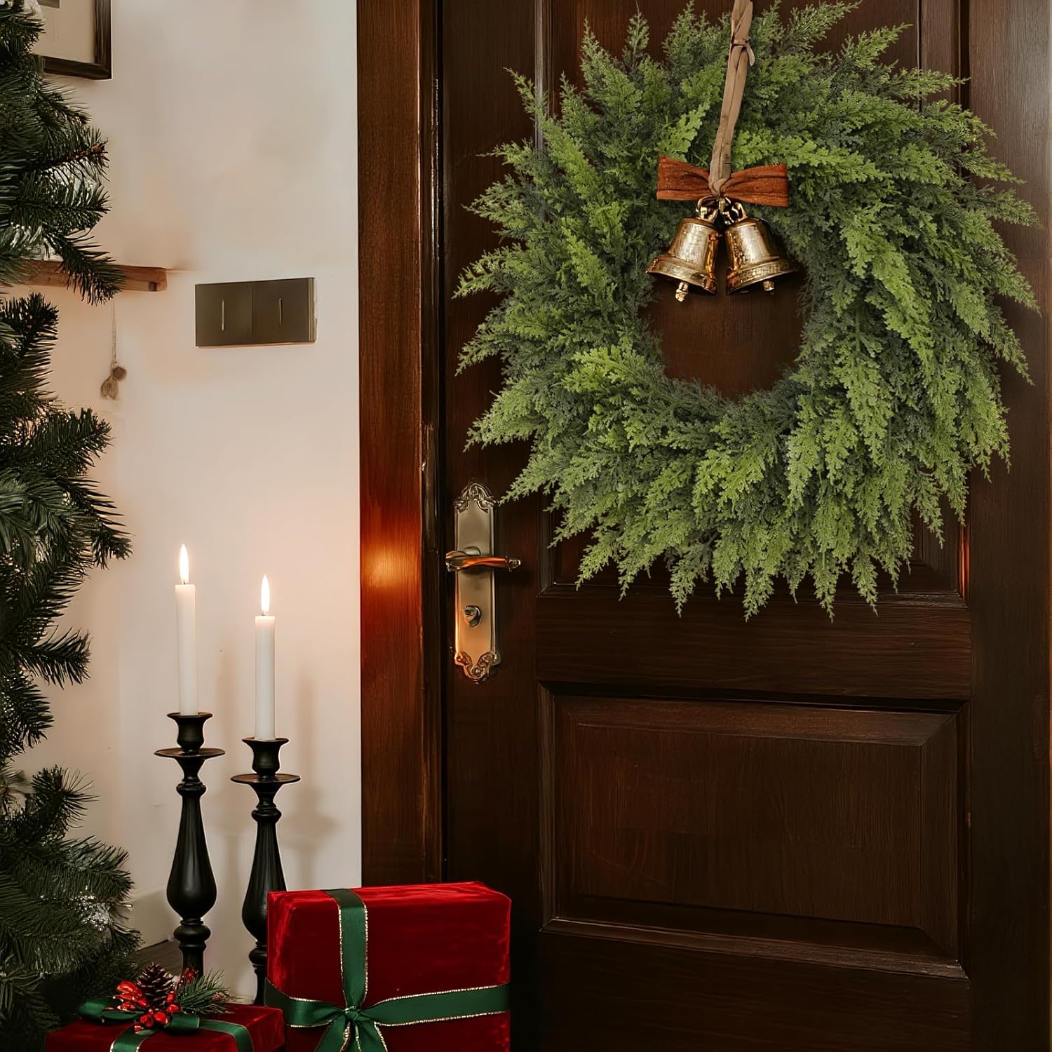 Realistic Christmas Wreath – Our Christmas cedar wreath is crafted with a unique technique to imitate the realistic appearance and touch of cedar pine, creating a lush, soft and plump Christmas wreath decoration. It is an indispensable item to add a Christmas atmosphere to your home.