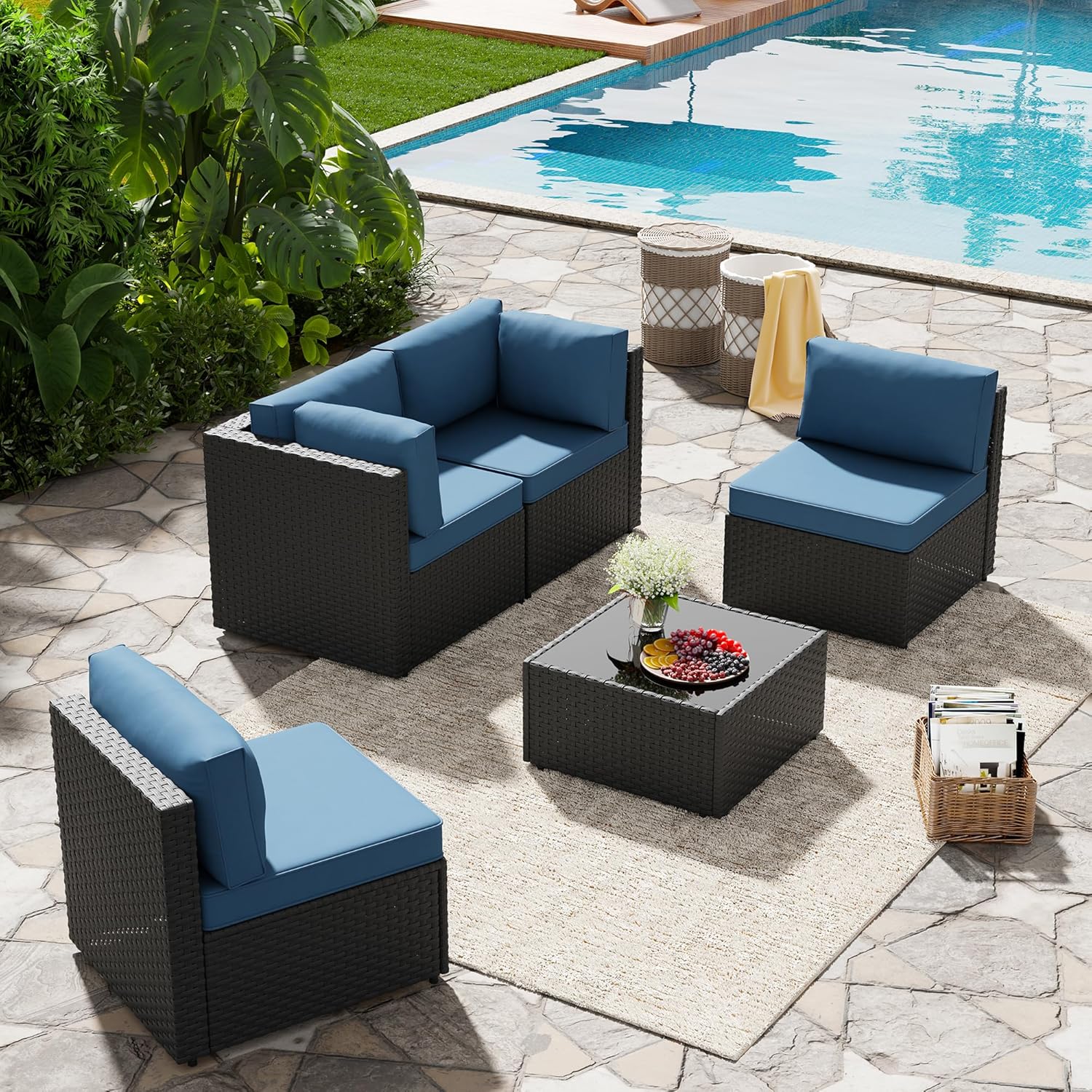 Easy to assemble: All parts is easy to assemble with clear instructions and all necessary accessories included. What you get: 5-piece patio conversation set contains: 2*Conner Sofas: 29.5 x 29.5 x 24.8 inches, 2*Armless Sofas: 29.5 x 25.6 x 24.8 inches, 1*Coffee Table: 25.6 x 25.6 x 13 inches
