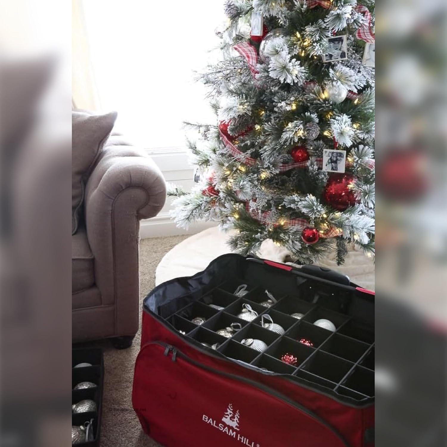 Balsam Hill just took my ornament storage game to the next level! 5 stars are not enough for this. Easy and quick to put together. The compartment dividers can be installed to create different size spaces and are easily adjusted. I left them out of an entire tray for large size items. The trays are easy to remove but stay in place if you want to use them like drawers. They have quite a bit of room between trays for stacking too. The zipper closes it all up tight and it rolls like a dream. Handy handles on the side help pull it to your storage area. I couldn’t be happier with this purchase. FIVE tubs of unorganized christmas junk in one spot. I may need to buy another!!