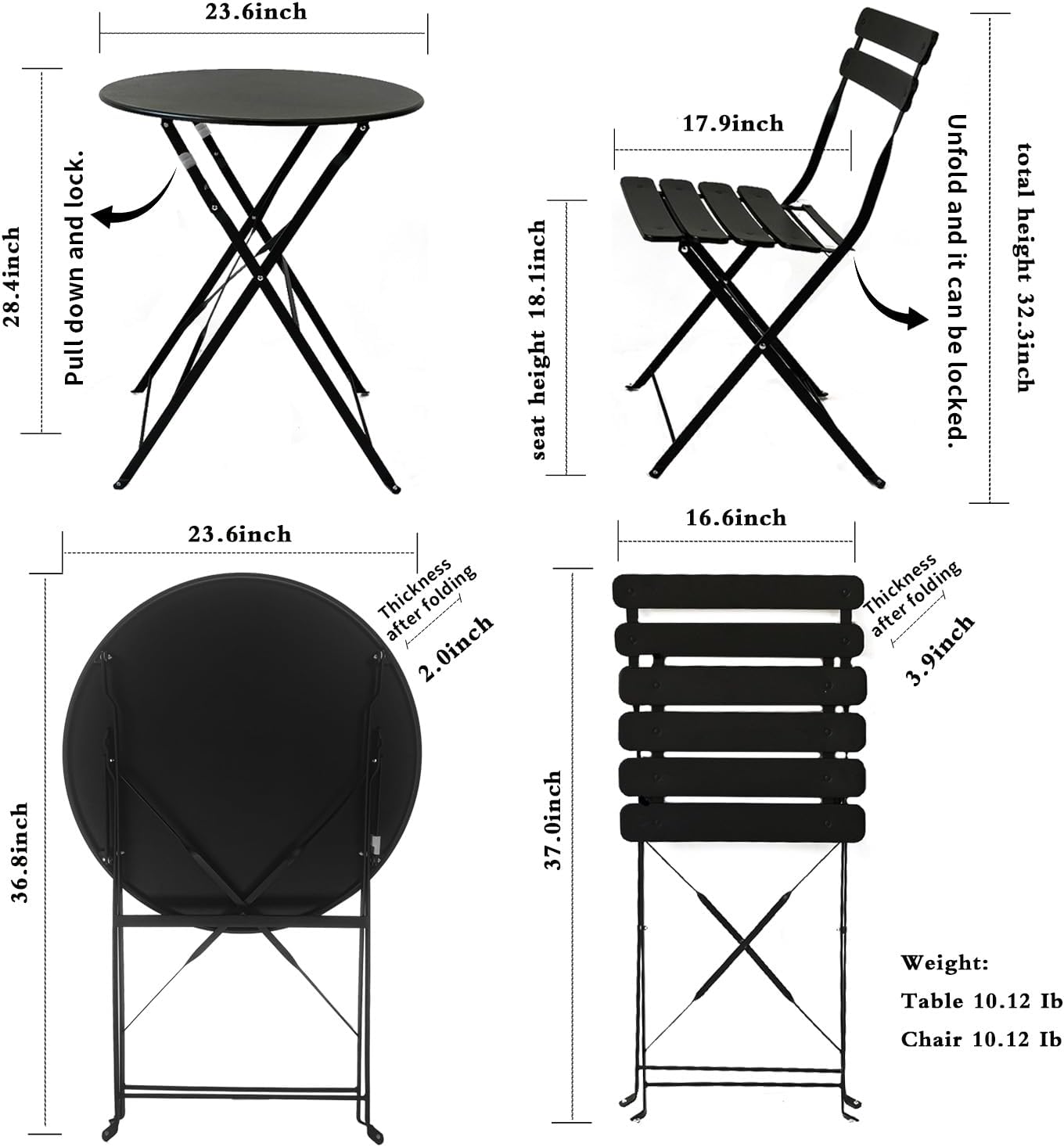 3-Piece Black Folding Bistro Set – Loveseat Pair for Home Office & Wedding