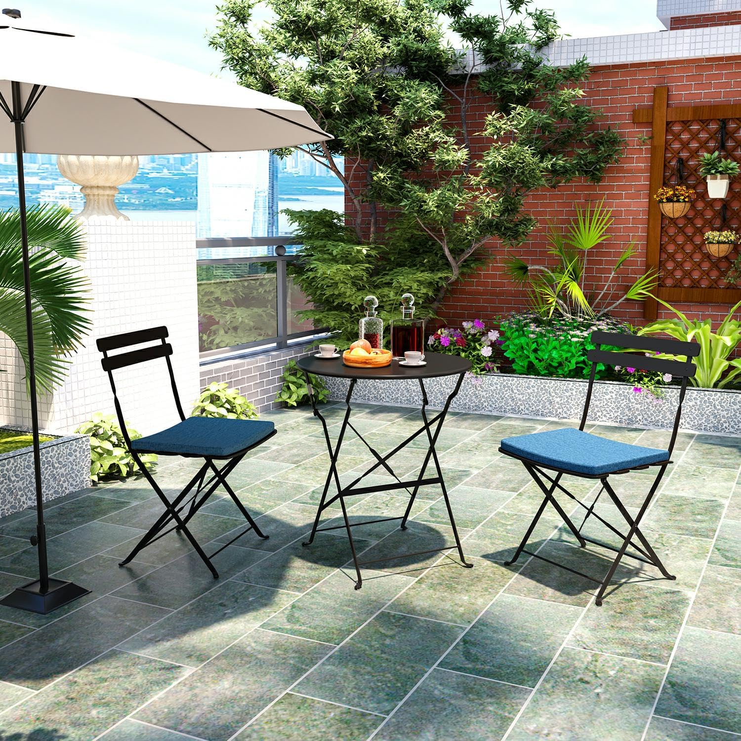 This 3-piece black metal bistro set with vibrant blue jute cushions brings a touch of luxury to balcony spaces and wedding decor alike. Set it up on a tiled balcony for newlywed morning coffee dates, or use it as a charming accent in outdoor wedding cocktail areas—its sleek folding design makes setup and storage effortless for wedding events. Crafted with rustproof powder-coated steel, it withstands outdoor elements year-round, and pairs beautifully with an outdoor loveseat (or patio loveseats) to create a cozy lounge nook for the couple, whether for their wedding day or daily life in their new home. A perfect wedding gift for couples who love outdoor relaxation, it fits small balconies, patios, or even wedding tent corners with ease.