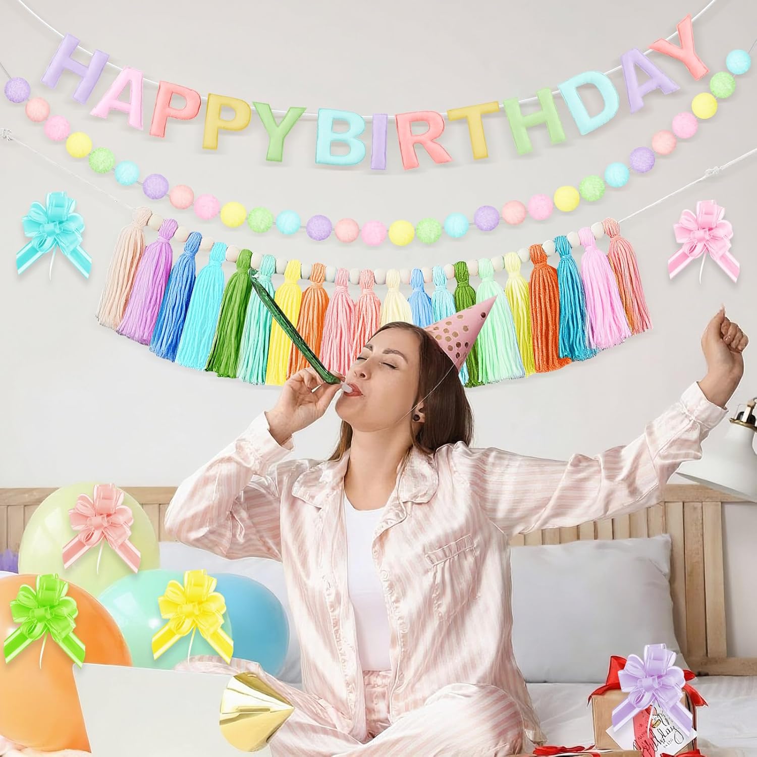 Birthday Party Decoration Set: our 4-in-1 party decoration set will definitely make your birthday party nice and make it wonderful; The set includes 1 pcs Pre Strung Happy Birthday Banner, 1 pcs Felt Ball Garland, 1 x Yarn Tassel Banner, 6 x Tulle Pull Flowers