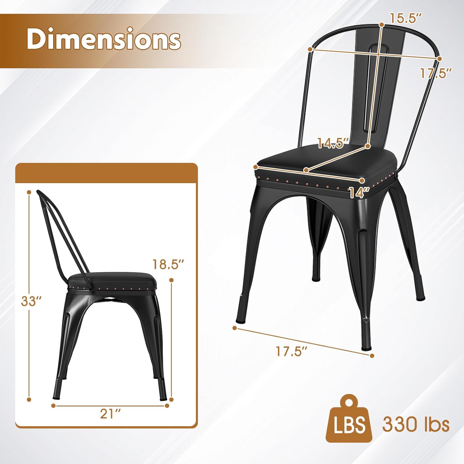 Comfortable Cushioned Seats: The metal dining chairs are equipped with 1.6” thick cushioned seats for an exceptional level of comfort. The seats are covered in skin-friendly PU leather, with exquisite rivets trimming the edge, adding to the aesthetic appeal and ensuring easy maintenance.