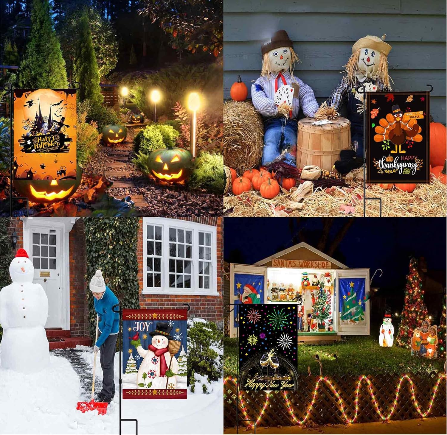 Application scenario – outdoor garden flag holder and holiday garden flags assortment sets can be used in any backyard, lawn, garden, deck, patio, porch or balcony to add joy to your all holidays