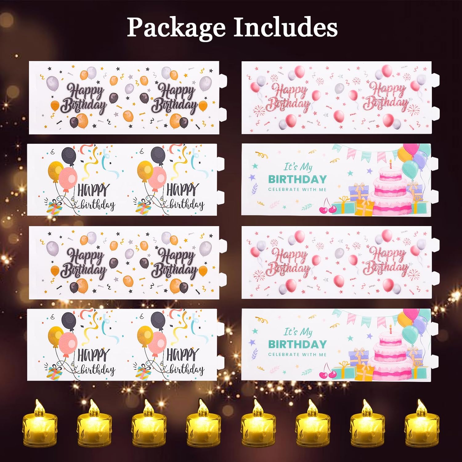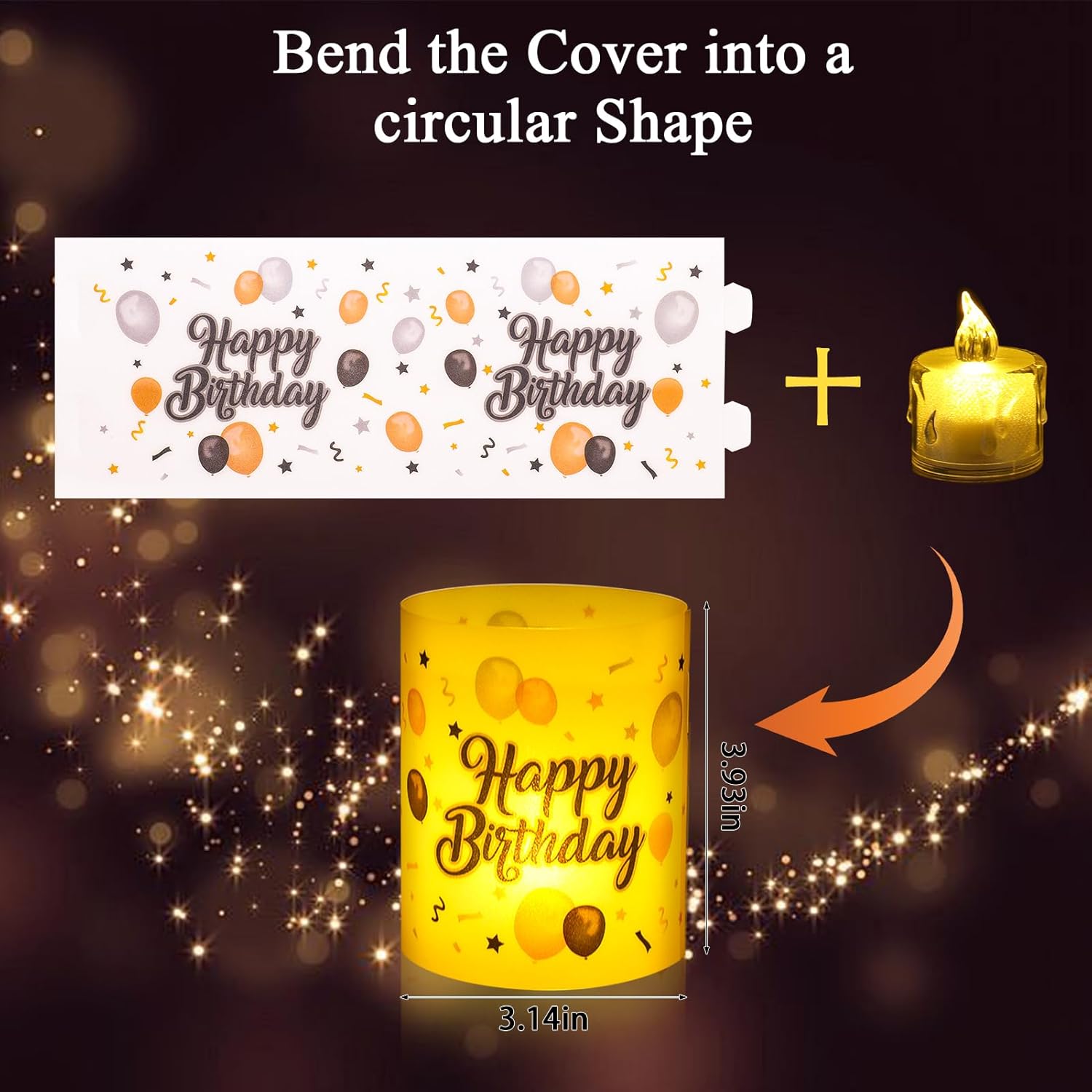 Package Includes: You will receive 8 Pcs Unfolded Birthday Candle Sleeve for Birthday Party Table Decor: 27 x 10cm, Folded: 10 x 8 cm. And 8 Pcs LED Tea Light Candles. You can match this Happy Birthday Candle Shade Cover with Flameless Votive Candles. Our cute Birthday Candle Holder are eye-catching embellishments on your festive table.