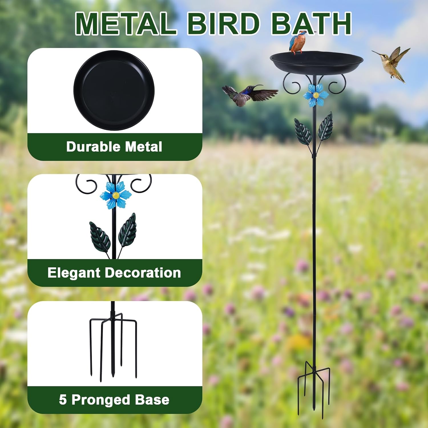 [Upgraded 5-Pronged Base]-This hogardeck metal bird bath is made from high-quality metal materials with protective coated finish on the surface, making it sturdy, durable, and resistant to rust. The upgraded 5-pronged base features an anti-tip design, providing greater stability for the birdbath and ensuring it stands firmly in the soil of your garden. Please ensure that the prongs end are fully inserted into the soil.