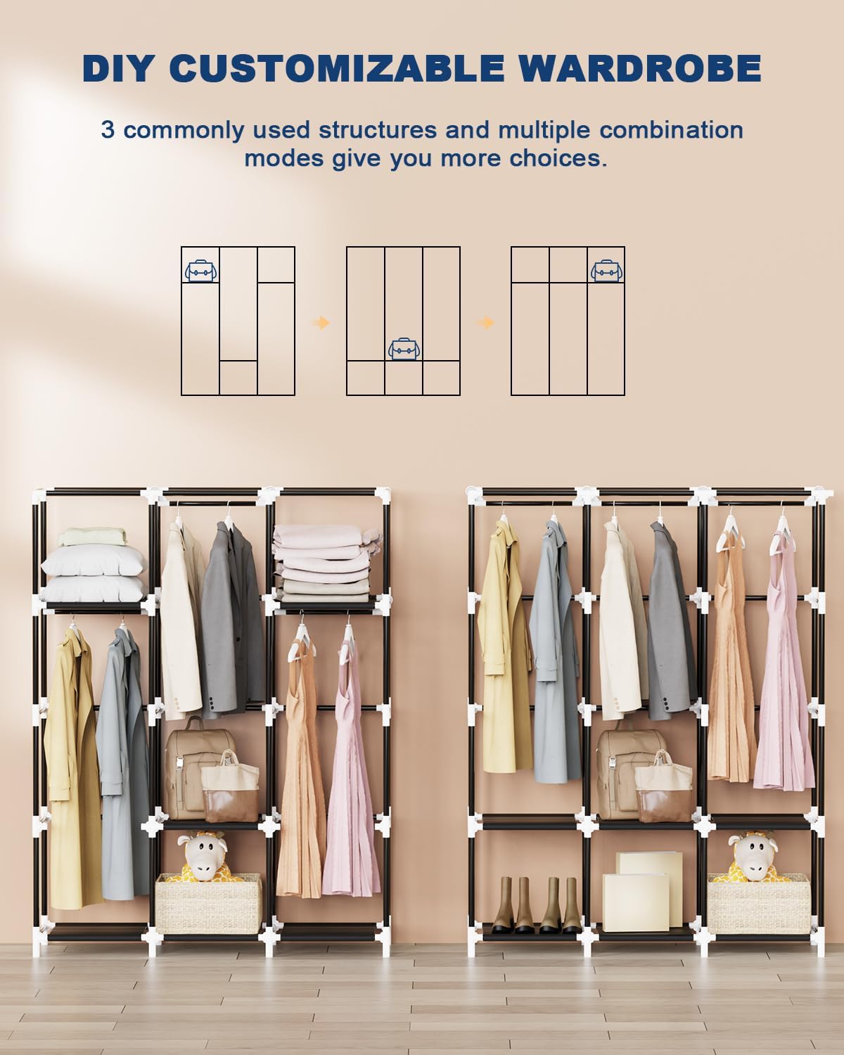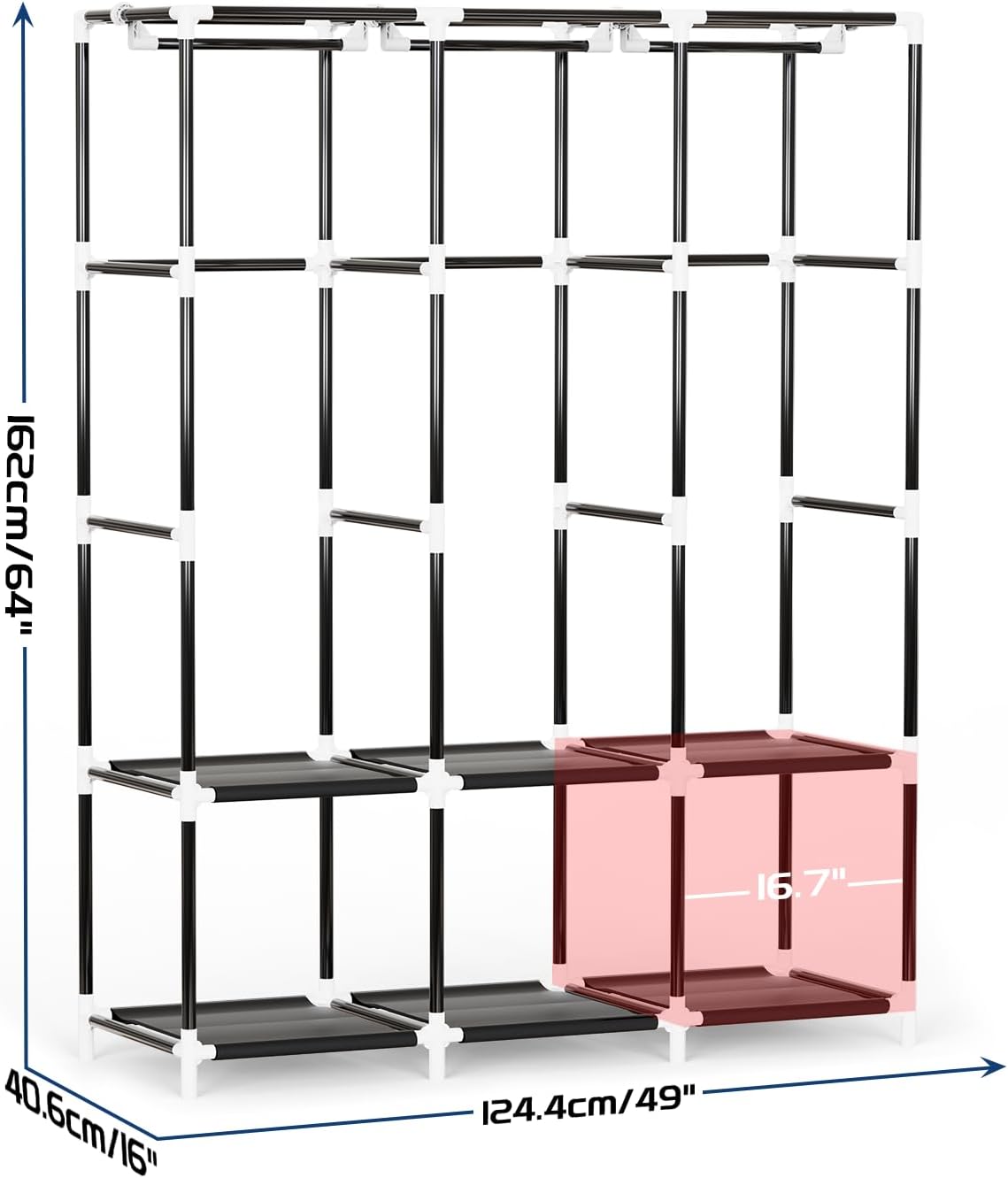 [Large Closet Storage]: This portable closet wardrobe consists of 4 movable hanging rods for clothes, jackets, dresses, coats; storage shelves for folded clothes, bags, hats, accessories, underwear and socks.