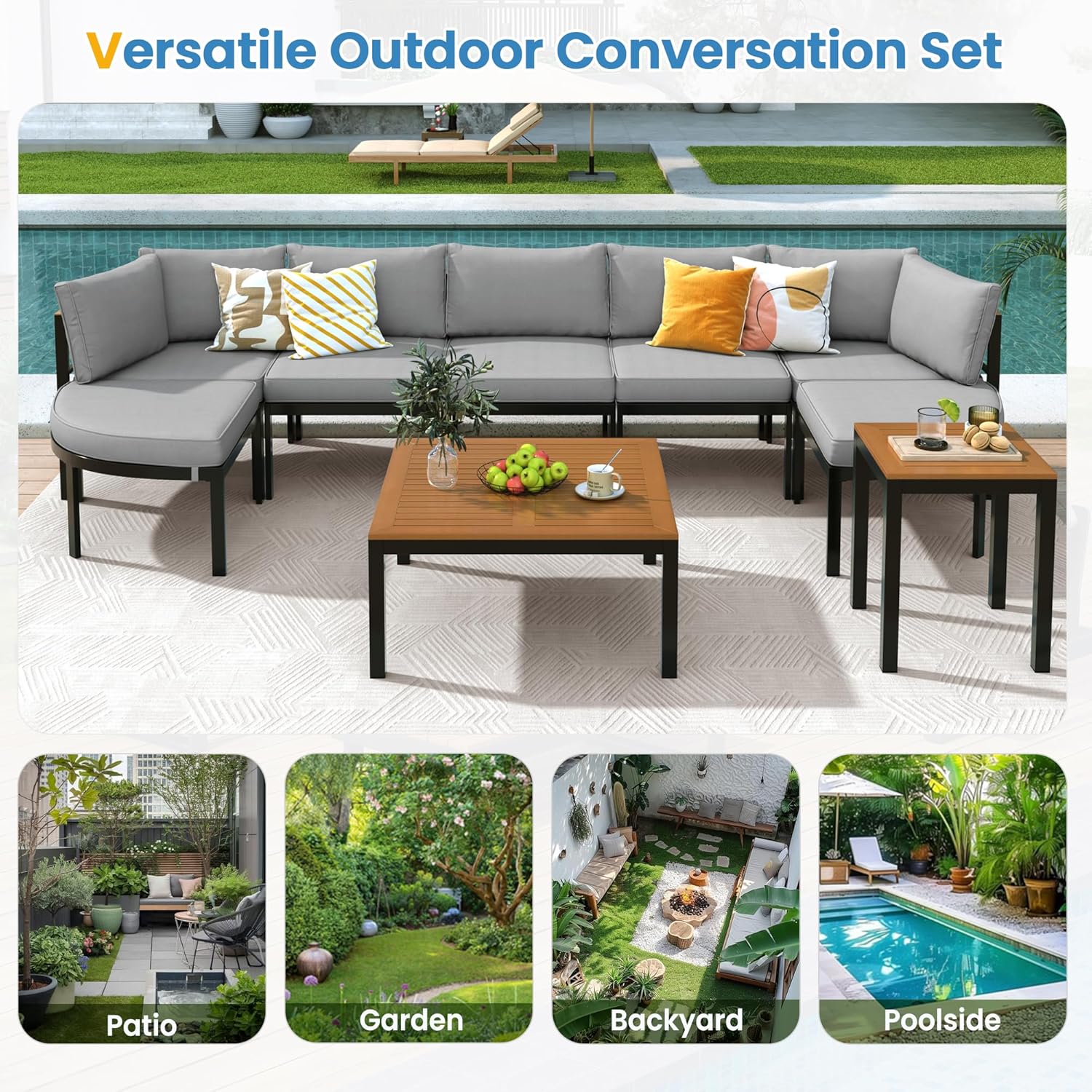 🌟 Elegant Outdoor Aesthetic – With a modern black metal frame, neutral-tone cushions, and natural wood-like tabletops, this set effortlessly complements a variety of outdoor styles.