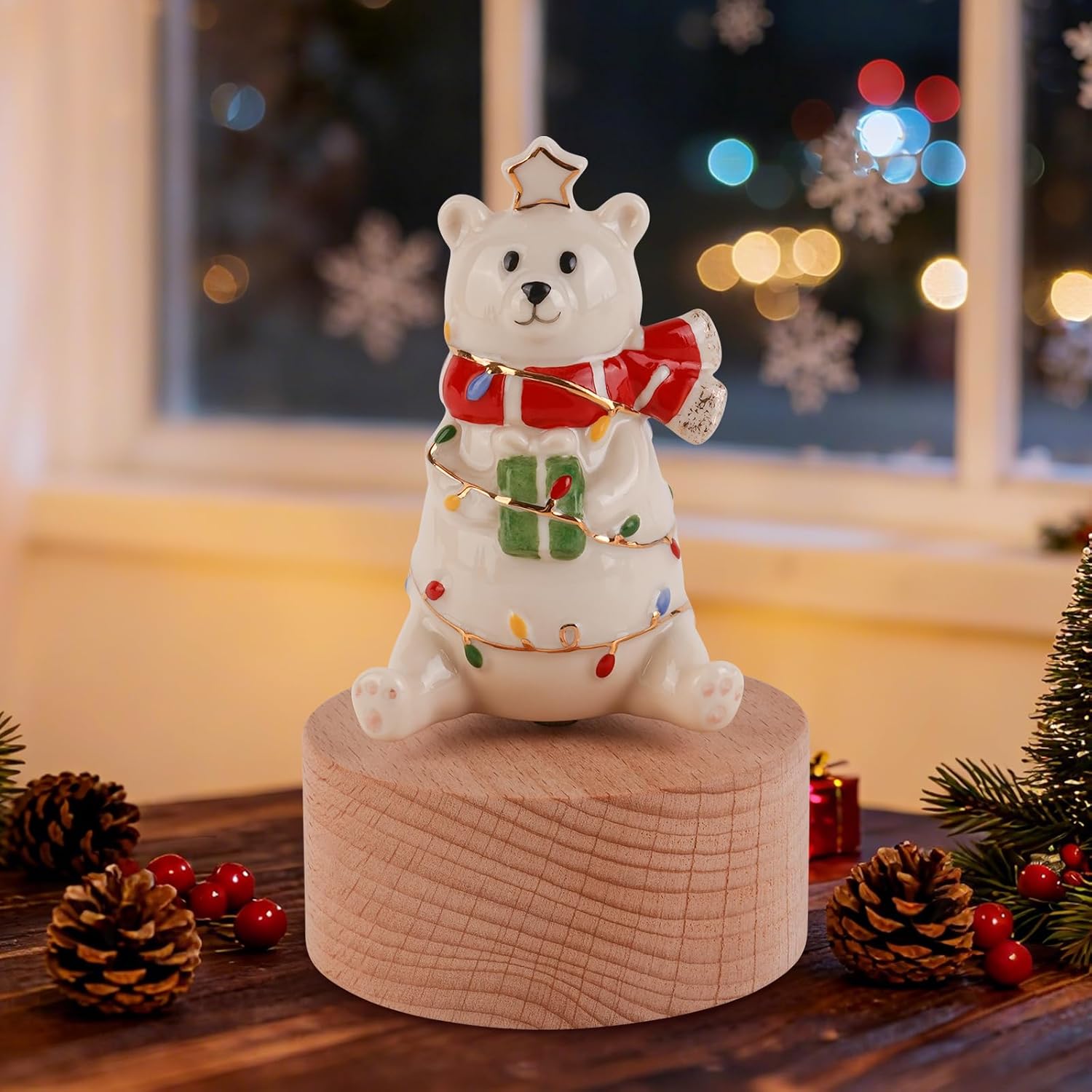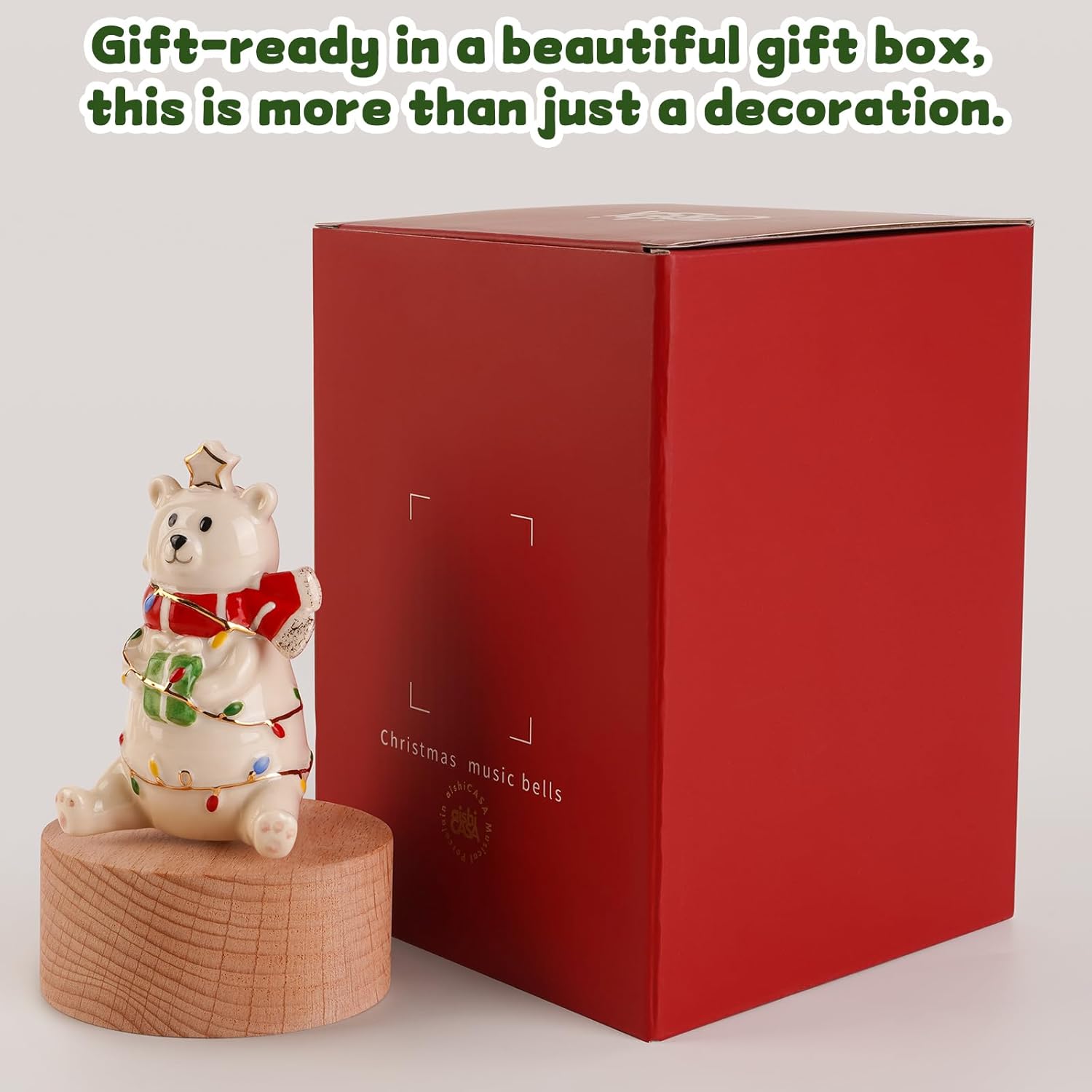 【Solid Wood Base for Stability & Elegance】Crafted with a high-quality solid wood cylinder base, this music box ensures durability and provides a stable, elegant foundation for the rotating ceramic display. The natural wood grain adds a touch of rustic charm to your Christmas decor.