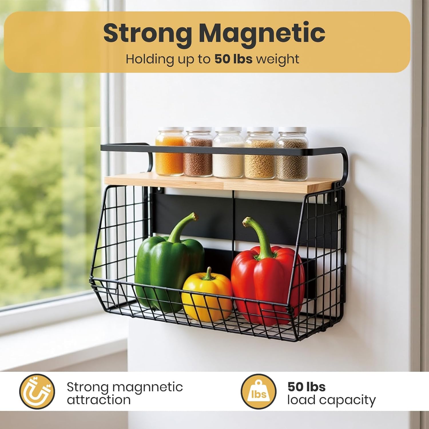 Our magnetic basket has 2 widened magnets on the back, which have strong magnetic force, their capable of supporting up to 50lbs of weight. This magnetic suction feature allows the shelf to be easily attached to any metal surface, such as a refrigerator or a metal shelf, without the need for any additional support. Makes it ideal for using in kitchen or other spaces where storage is limited.