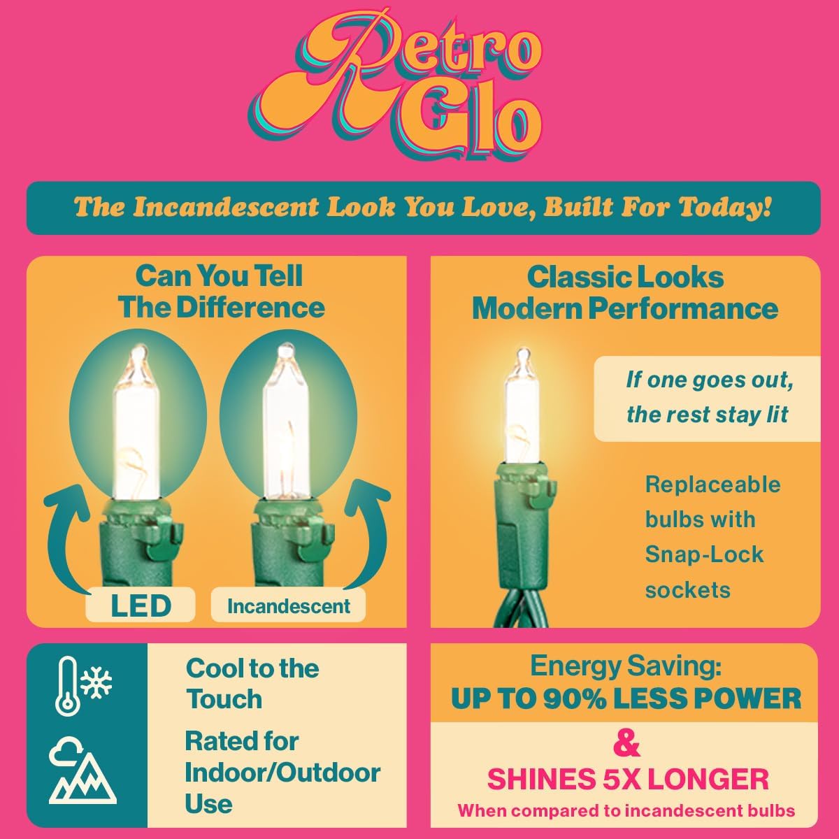 Experience the warmth of classic Christmas lights reimagined for the modern era. RetroGlo LED mini lights are crafted to perfectly replicate the charm and visual warmth of old-fashioned incandescent strands—right down to the color tone and soft diffusion of light. Each bulb features a 2700K warm white LED core encased in a glass shell, capturing the traditional sparkle and hue that customers love while using a fraction of the energy. The light is soothing to the eyes, eliminating the harsh glare often associated with LEDs and reducing visual fatigue. Developed in close partnership with our manufacturer, RetroGlo uses a custom LED form factor that imitates the size, shape, and glow pattern of classic incandescent mini bulbs. Each strand includes 100 bulbs, spaced 2.5″ apart along durable White wire, with interchangeable bulbs and fuses for long-lasting use and easy maintenance. Whether you’re wrapping trees, trimming the roofline, or illuminating indoor décor, RetroGlo combines authentic incandescent beauty with LED efficiency, safety, and durability—for lighting that feels timeless.