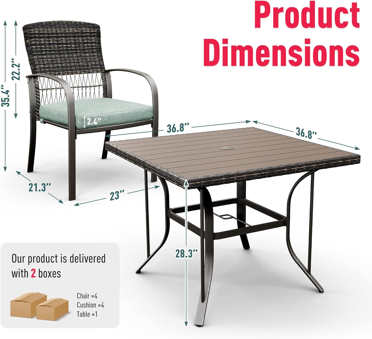 【Creat Outdoor Comfort Zone】 Including a square dining table and 4 rattan chairs with soft cushions, this outdoor dining set is a relaxing place to have meals or hold a party and can be widely used for patio, deck, backyard, garden, poolside,etc.