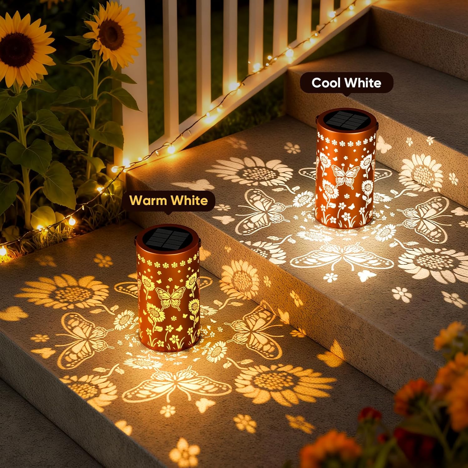 【Enhance Your Garden Parties with Magical Ambiance】Our solar lanterns project mesmerizing butterfly & sunflower patterns, transforming your garden or patio into a captivating wonderland for unforgettable parties and family celebrations. No wires needed for effortless setup.