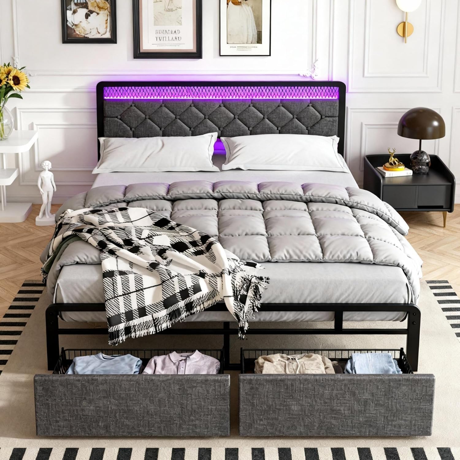 SUNLEI Queen Size Bed Frame with 2 Drawers, Upholstered Platform Bed Frame Queen with Led Light, Metal Platform Bed, Easy Assembly, No Box Spring Needed, Grey