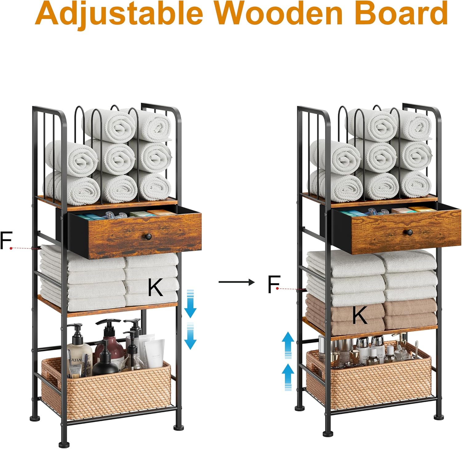 【Spacious 4-Tier Organization】Maximize your bathroom towel storage with this elegant free standing towel rack. It features 4 large tiers, including a handy drawer, offering ample towel storage for small bathroom essentials. Perfectly organize all your bath towels, hand towels, and washcloths in one centralized towel holder stand, eliminating clutter and bringing a spa-like order to your space.