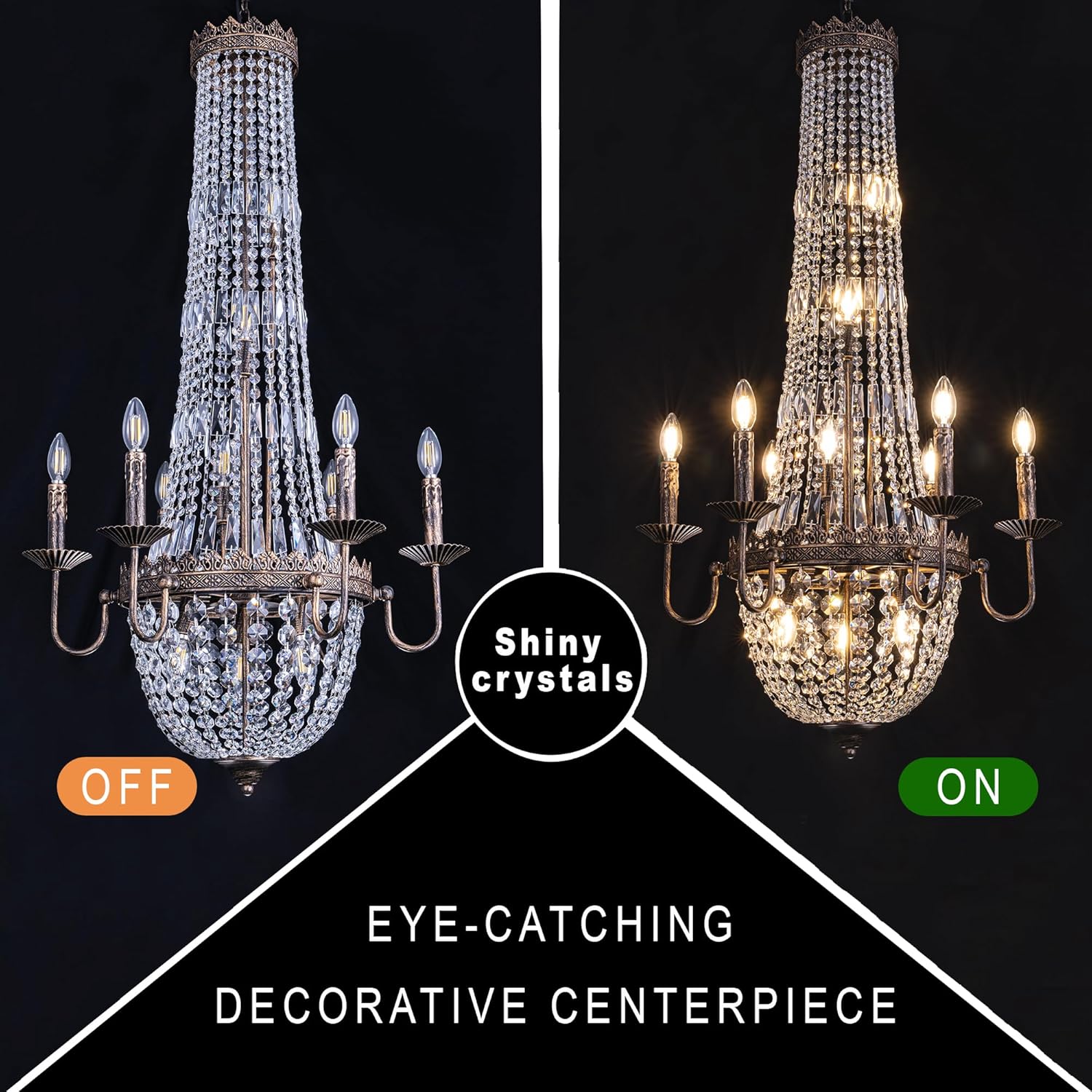 Luxurious Design: This exquisite French court crystal chandelier boasts a long and fluid court style, featuring a total of 12 E12 light source sockets that emit a soft glow. Its intricate metalwork and sparkling crystals exude an air of opulence and grandeur