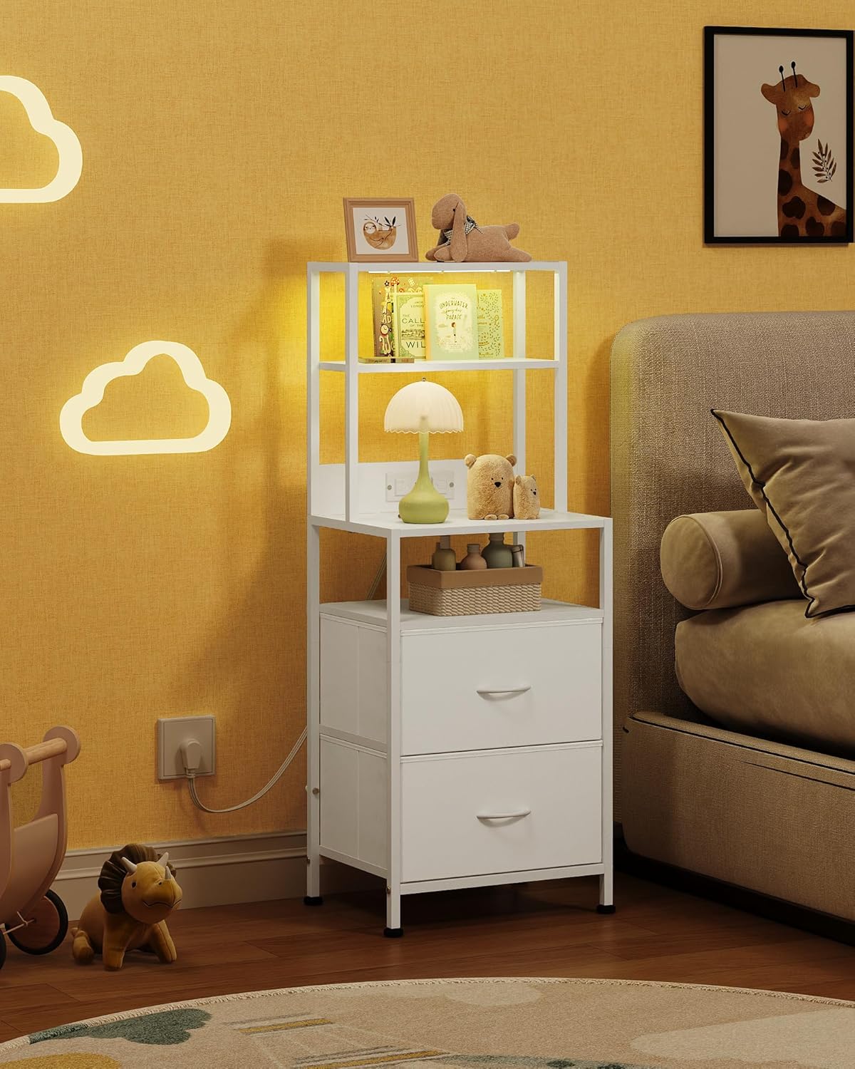 8 reviews for WLIVE Nightstand Set of 2 with Charging Station, LED Night Stands with 2 Fabric Drawers and 4 Storage Open Shelves, Bedside Table Sets for Bedroom, White